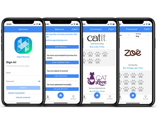 Moving from a paper-based frequent buyer program to a digital one to drive loyalty and basket was a goal of Hagen, a pet food company in Canada. Independent retailers were using outdated paper-based loyalty programs that were challenging for both the customer and the retailer. A new Punch-Card Loyalty Mobile App enabled customers to take photos of receipts and earn punches for six different brands participating in the program. When a customer filled a Punch-Card, they received a coupon for a free bag of pet food.