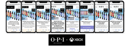 Xbox partnered with OPI on a global, exclusive line of nail polish. Consumers were rewarded with in-game content for Forza and Halo by purchasing qualifying OPI products and uploading their receipts. The program was launched across 12 countries and was localized, including market-specific languages, qualifying rules, customer service, and micro-sites. Xbox and OPI were able to track individual programs and the entire program overall, providing them with a wealth of purchase data.