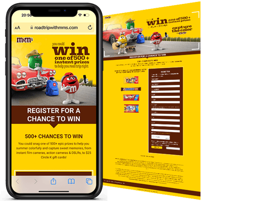 M&M’s was looking to create an exclusive promotion at Circle K to reward consumers with a variety of road trip inspired instant prizes! Snipp developed a register to enter instant win program where consumers could go to the program microsite and register for a chance to win hundreds of Instant Prizes from Circle K Gift Cards, Go Pro's, and Canon and Polaroid Cameras. The customer is entered and verified with a unique email and phone with a 2fa combo and either wins or loses. Snipp managed all backend components of the program including microsite development, entry collection, instant win logic, prize procurement & fulfillment, and reporting. Click here to learn more about this promotion.