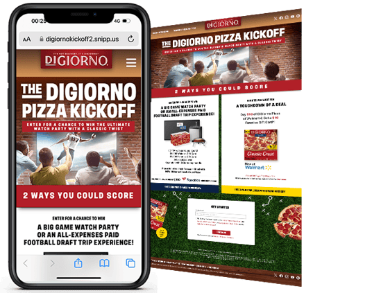 Nestle DiGiorno wanted to drive engagement and trials on a new product, DiGiorno Classic Crust at Walmart. To promote trial and engagement, DiGiorno is offering consumers a Walmart e Gift Card for the purchase of any DiGiorno products. Snipp created a gift with purchase program with a sweepstakes overlay where consumers receive their gift cards for Digiorno purchases. Just for participating, consumers are also entered into a sweepstakes to win football-related prizes around the Big Game. Additional sweeps entries can be earned each time they purchase, for referring friends, sharing on social, opting into the CRM and daily microsite visits. Snipp handled the program end-to-end including UX, creative, program development, legal and prize fulfillment. To learn more, click here.