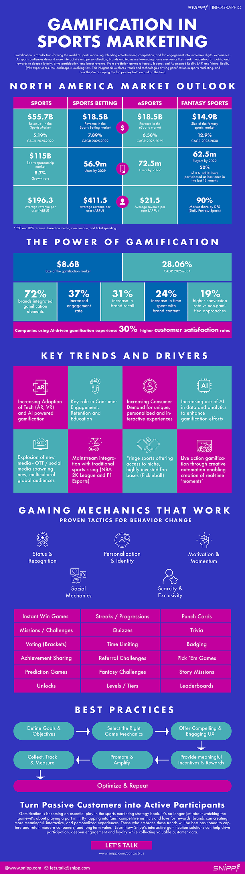 Gamification is becoming an essential play in the sports marketing strategy book. Itʼs no longer just about watching the game—itʼs about playing a part in it. By tapping into fansʼ competitive instincts and love for rewards, brands can creating more meaningful, interactive, and personalized experiences. Those who embrace these trends will be best positioned to capture and retain modern consumers, and long-term value. Learn how Snippʼs interactive gamification solutions can help drive participation, deepen engagement and loyalty while collecting valuable customer data.