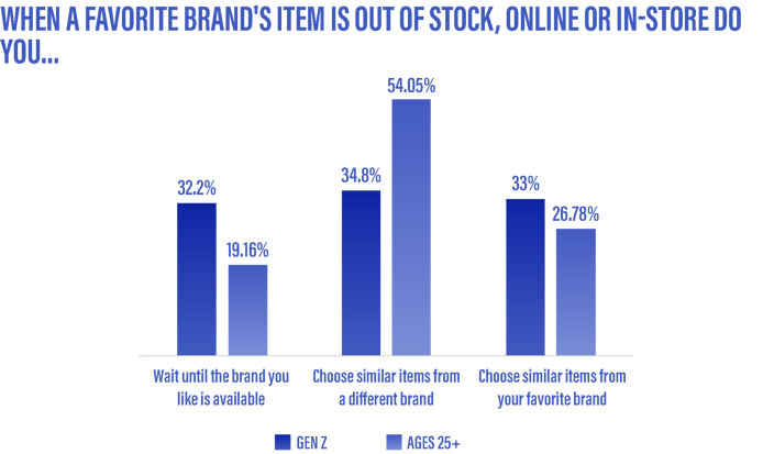 Gen Z consumers exhibit surprising levels of loyalty, as revealed in our recent survey, "Inflation and the Ever Evolving Shopper Dec 2022." When faced with out-of-stock situations, Gen Z individuals are less likely to choose alternative items from different brands at significantly lower rates. Instead, they prefer to wait until the brand they prefer is back in stock, showcasing their loyalty to their preferred brands.