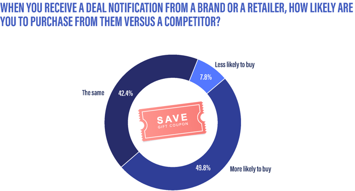 Deals play a crucial role in driving sales, as highlighted by our survey findings. Nearly half (49.8%) of the respondents stated that they would be more inclined to make a purchase from their favorite retailer or brand compared to a competitor if they were presented with a deal. This emphasizes the significant impact that attractive offers and promotions can have on consumer behavior and their purchasing decisions.