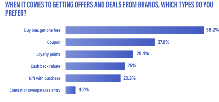 - Buy one, get one free (BOGO) is the most favored type of offer among Gen Z, chosen by 58.2% of respondents.