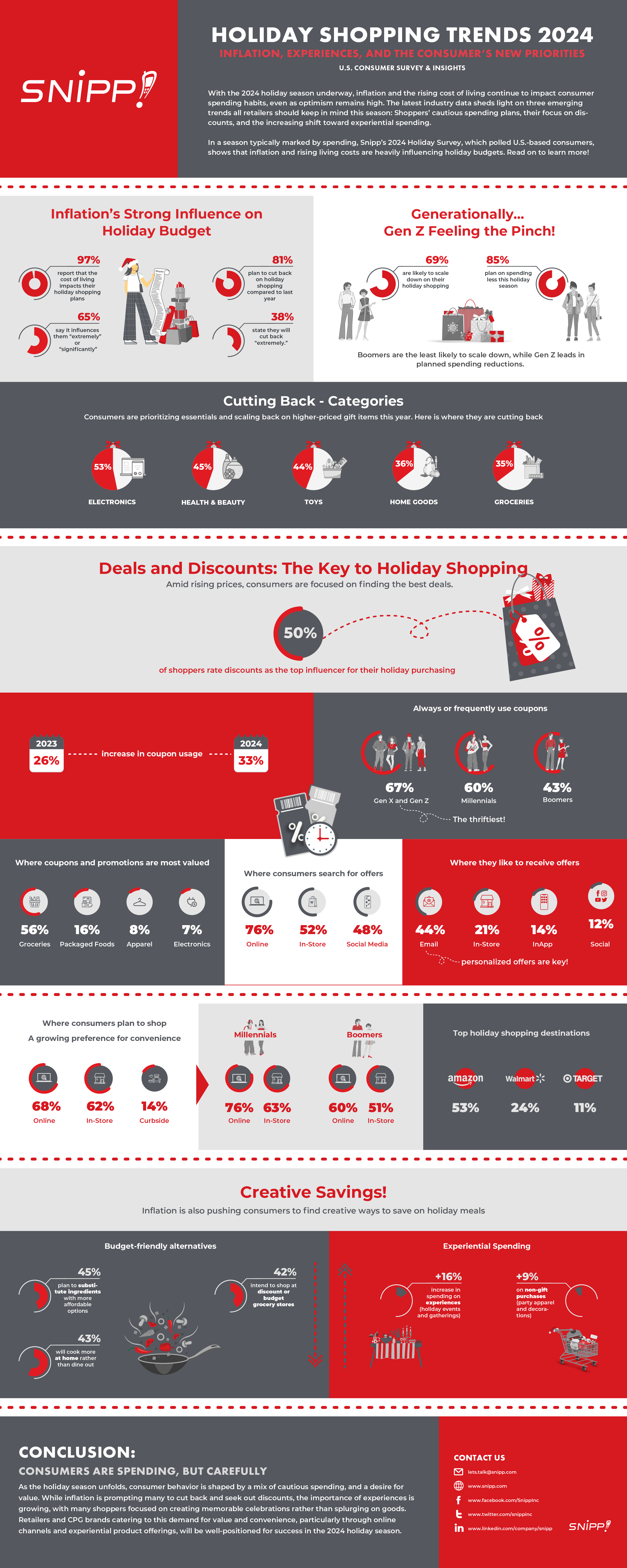 With the 2024 holiday season underway, inflation and the rising cost of living continue to impact consumer spending habits, even as optimism remains high. The latest industry data sheds light on three emerging trends all retailers should keep in mind this season: Shoppers’ cautious spending plans, their focus on discounts, and the increasing shift toward experiential spending. In a season typically marked by spending, Snipp’s 2024 Holiday Survey, which polled U.S.-based consumers, shows that inflation and rising living costs are heavily influencing holiday budgets. Read on to learn more!