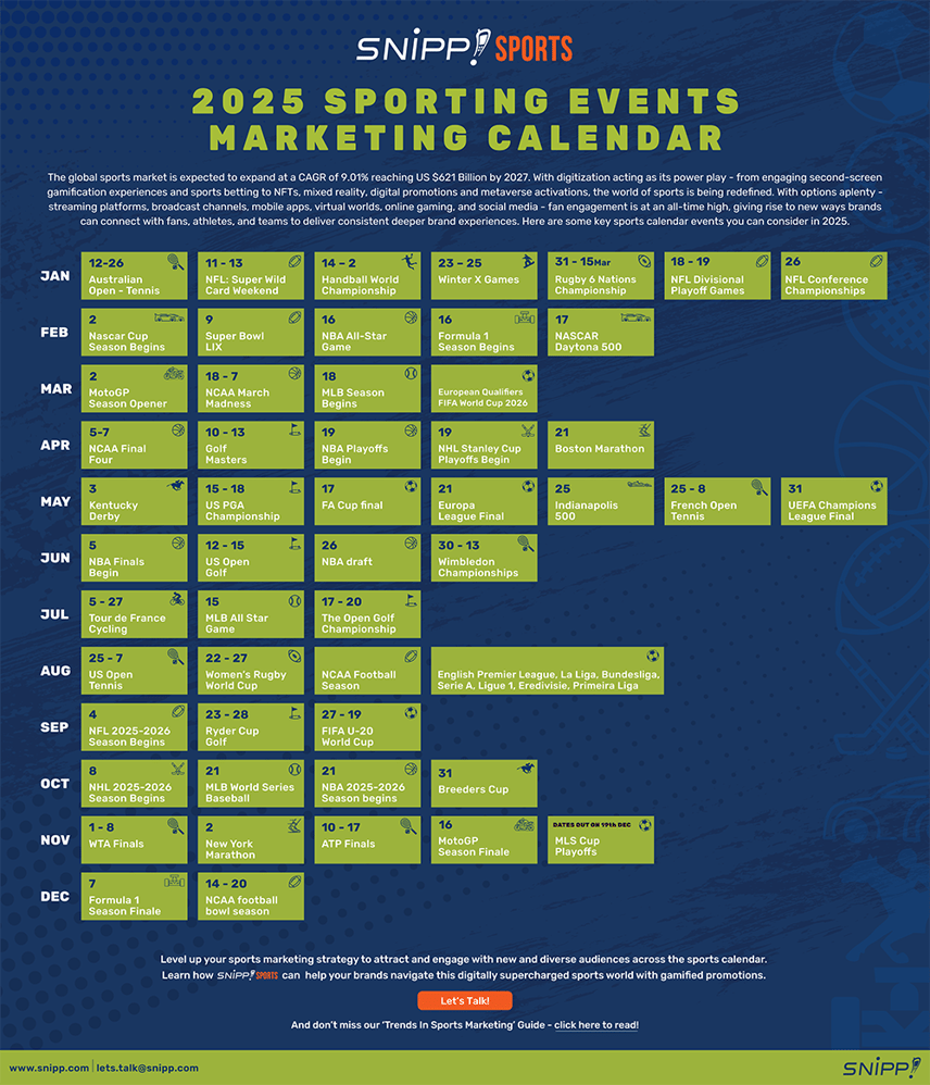 Use this sports calendar to develop your brand's sports marketing plan. To consult with one of our experts on a specific event, contact us by clicking here.