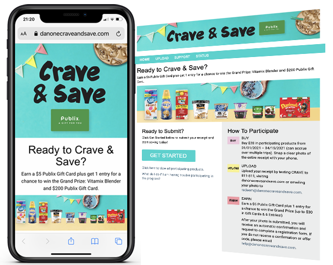 Snipp developed a digital punch card offer where consumers who purchase $20 of Danone products in a single or multiple trips could submit their recipet by texting in the keyword CRAVE or direct upload at www.danonecraveandsave.com to earn a $5 Publix Gift Card. All receipts submitted also gives the consumer an entry into a sweepstakes. Consumers could track their progress towards their next reward on the site.