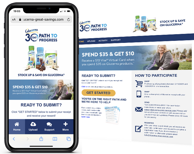 Snipp developed a gift with purchase program to drive consumers to increase typical spend amounts and to drive repeat engagement to keep them from straying to competitive brands. Consumers who purchase $35 or more worth of Qualifying Products in the same transaction from a Qualifying Retailer can submit their receipt to receive a $10 digital visa prepaid card. Receipts can be submitted by texting GLUCERNA to 811-811, via email at redeem@glucerna-great-savings.com, or online
