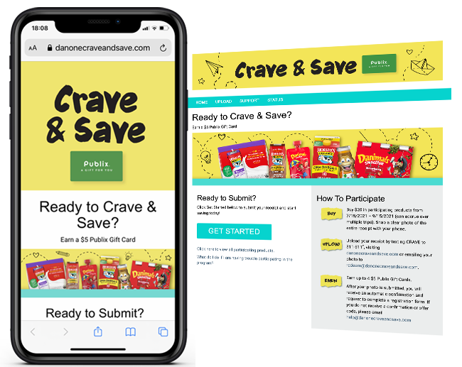Leveraging Snipp's receipt processing technology, consumers who purchase $20 worth of participating Danone products in a single or multiple transactions earn a $5 Publix Gift card! Consumers can track their progress to their next reward by logging into the site and see how close they are to their next reward. Receipt submission is enables by Website https://www.danonecraveandsave.com/ , MMS - text to 811811 and e-mail - redeem@danonecraveandsave.com