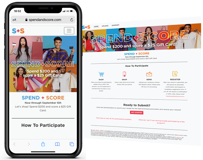 Snipp built a punchcard promotion on our Receipt Processing platform, where consumers who spend $200 at qualifying PREIT Property Mall Retailers in one or multiple transactions, text the promotion keyword SCORE to 811 811 and upload their receipts on the promotion landing page https://www.spendandscore.com/. Once they hit the $200 purchase threshold, Snipp will send them a reward credit of $25 to be redeemed at a custom reward store.