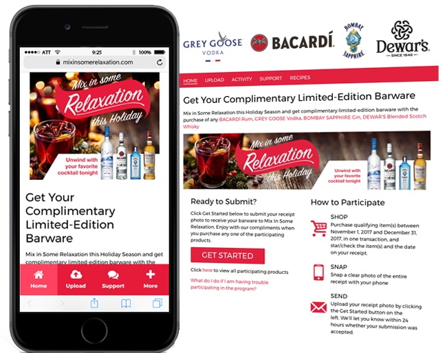 Bacardi wanted to boost portfolio sales in the drug channel during the must-win holiday season. Snipp created an age and state-gated promotion that rewarded consumers with limited-edition barware. Participants shopping in eligible states can access a microsite to upload their purchase receipt, proving the purchase of any qualifying products. To help bring the program to life for consumers, Bacardi created special cocktail recipes for each of their key brands and built custom displays. The consumers can access the microsite for program details and upload.