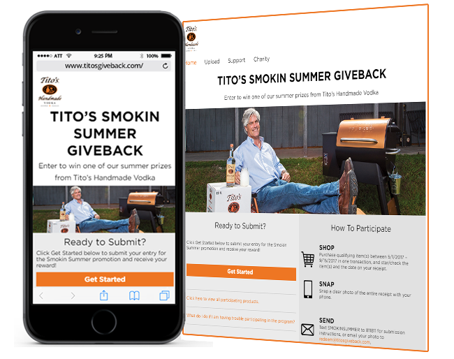 Snipp created a program where consumers over 21 can purchase any Tito's vodka bottle and submit their receipts by texting in the keyword SmokinSummer to 811811 or via web upload at http://www.titosgiveback.com/Default.aspx to receive an entry into a sweepstakes. Titos also donated $1 to a charity of their choice. Snipp age and state gated the program entries to adhere to alcohol consumption laws and to enable local selection of charities.