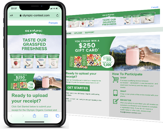 Snipp created a purchase based sweepstakes where consumers who purchase qualifying Olympic Yogurt products have a chance to win one of 20 $250 Sobeys Gift Cards! Consumers could submit their receipt online at olympic-contest.com (English), olympic-concours.com (French).
