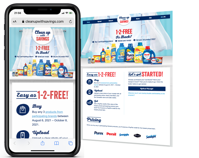 Leveraging SnippCheck, Snipp created a buy 3 get 1 free campaign where consumers who purchase any 3 qualifying products could submit their receipt on https://www.cleanupwithsavings.com/ (English) and https://www.cleanupwithsavings.com/fr (French) to get an instant PayPal rebate for the lowest priced product purchased. Snipp hosted the microsite, and the program was in English and French.