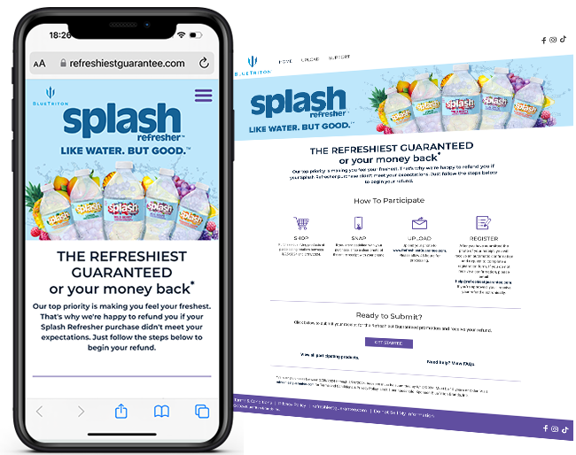 BlueTriton was rebranding and doing an item relaunch for their Splash line of products targeting shopper mom, and wanted to provide a Money Back Guarantee to show the confidence they have their product and incentive consumers to try their different flavors.