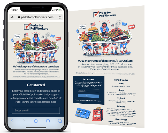 Chobani wanted to show support for the many thousands of dedicated Poll Workers in NYC and offer poll workers their first meal post-election. They needed a solution that was simple for them to enter as 50% of poll workers are over 60.