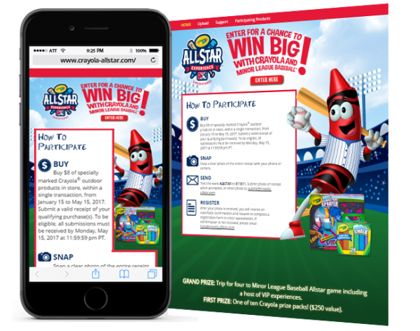 Snipp created a sweepstakes program where consumers who purchased at least $8 worth of participating Crayola products in one transaction at any retailer could send in their receipt by texting in the keyword ALLSTAR to 811811, by email to submit@crayola-allstar.com or via web upload at http://crayola.com/allstar to receive an entry into a sweepstakes. The grand prize was a trip for four to a Minor League Baseball All-Star game including a host of VIP experiences.