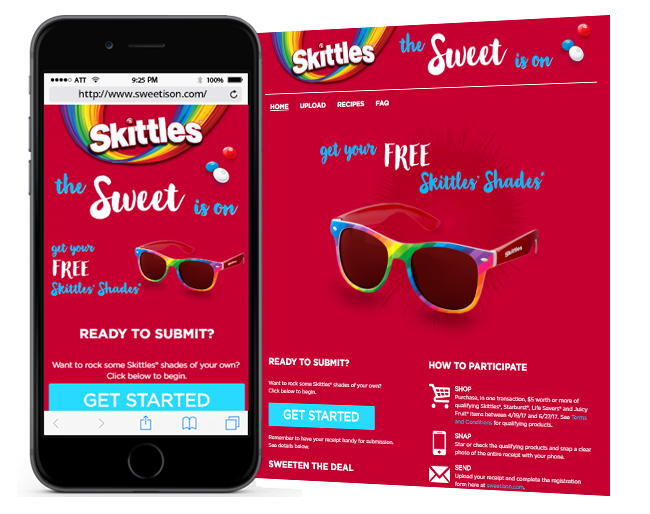 Snipp created a program on the SnippCheck platform where consumers who purchase $5 on qualifying products can submit their receipt by texting in the keyword SWEETS to 811811 or via web upload at http://www.sweetison.com/ to receive a pair of skittles sunglasses.