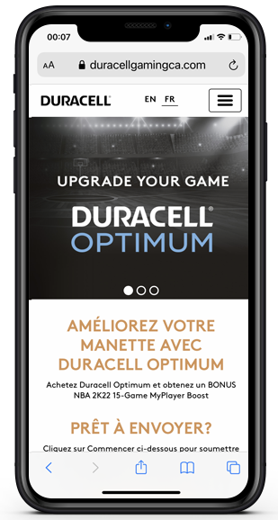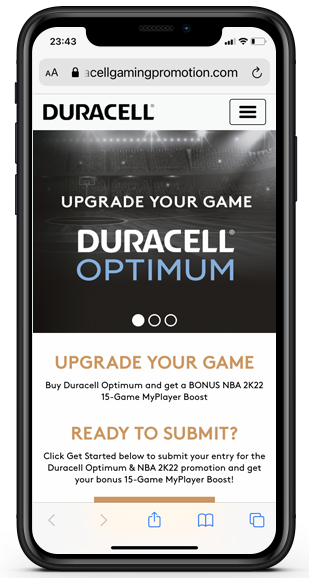 Snipp built a gift with purchase promotion to drive engagement on our receipt processing platform. consumers who purchase qualifying product can upload a photo of their receipt by texting the key word UPGRADE (US) or DURACELL (CAN), via e-mail to redeem@duracellgamingpromotion.com (US) or redeem@duracellgamingCA.com (CAN) or web upload to receive an NBA 2K22 15-Game MyPlayer Bonus