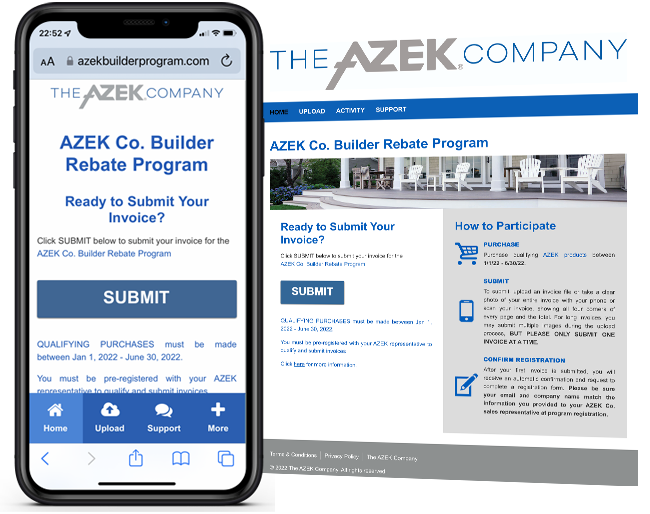 Snipp relaunched the program on our our omni-channel B2B Loyalty platform. Pre-qualified home builders earned a rebate of up to 4% of their purchase price depending on how much Azek products they purchased. Contractors to upload invoices via desktop and mobile at https://www.azekbuilderprogram.com/. The program will run in two payout phases across the year.