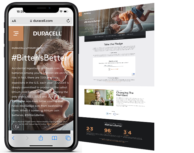 As part of their mission to help ensure children everywhere are protected, Duracell is encouraging consumers to take the pledge by swapping out the lithium coin batteries in their home with Duracell Lithium Coin Batteries with Bitter Coating. Duracell needed a quick to market fix for their live program to encourage consumers to take a pledge and switch to Duracell Lithium Coin Batteries with Bitter Coating.