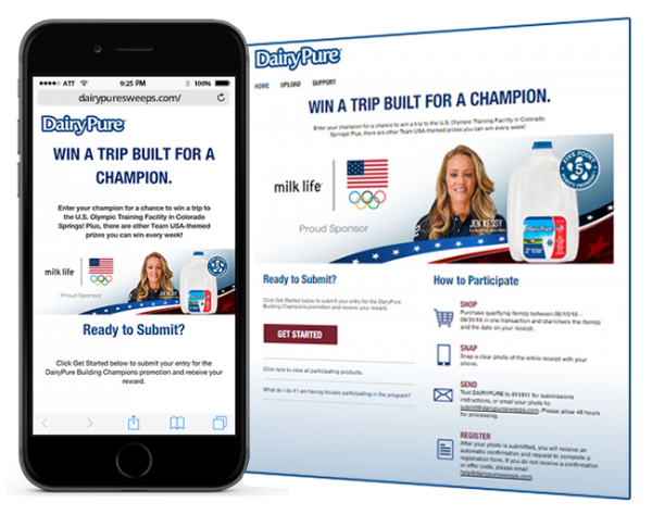 Consumers who purchase participating DairyPure products can submit their receipt by texting in the keyword DAIRYPURE to 811811, by email to submit@dairypuresweeps.com or via web upload to receive an entry into the sweepstakes. Prizes included a weekly prize and/or a Grand Prize of a trip to the US Olympic Training Center in Colorado Springs, CO.