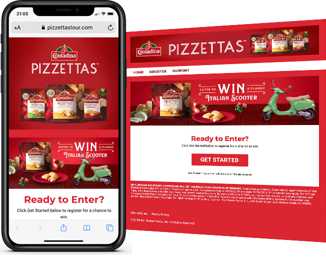 Snipp worked with Del Monte’s agency to execute a turnkey mobile promotion tied to out-of-home advertising and event marketing. Consumers who attended special Contadina events at food festivals or supermarkets were able to interact with a custom food truck and brand ambassadors to sample the product and text BITES to 811811 or register online at www.PizzettasTour.com to enter a to win a sweepstakes to win an authentic Italian scooter. Snipp secured and fulfilled the prize.