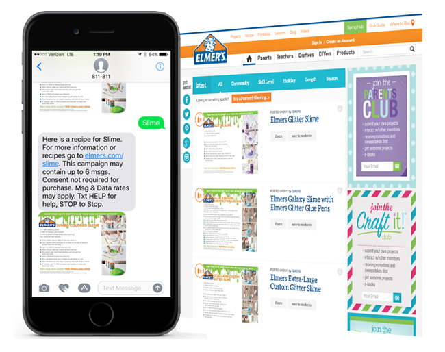 Snipp created a text-to-receive program where consumers can text in the keyword SLIME to 811811 to get a recipe (image) on how to make Slime using Elmer’s Glue, along with a link to the website for more recipes.