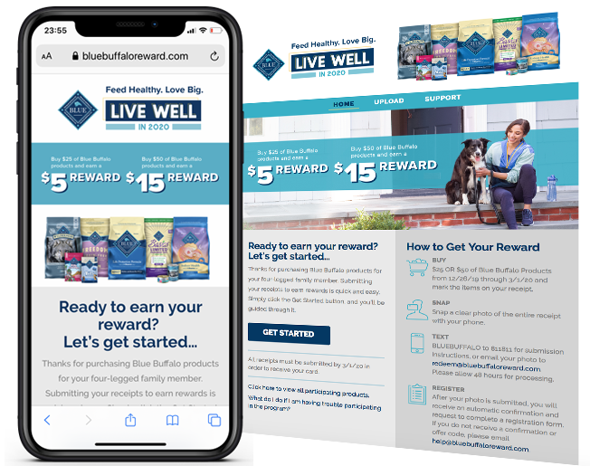 Snipp developed a tiered gift with purchase program that rewarded pet owners for not only buying Blue, but also spending more. Consumers could submit their receipt by texting in the keyword BLUE BUFFALO to 811 811, via email to redeem@bluebuffaloreward.com or web upload to receive a gift card. Pet owners shopping at Kroger received a Kroger gift card. All other shoppers received a Digital VISA® Prepaid Card. A $25 spend earned them $5 reward and a $50 spend earned them a $15 reward.