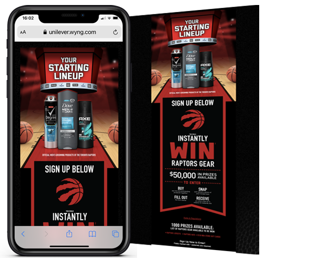 Unilever leveraged Snipp's receipt validation and instant win technology to create a program where consumers could purchase participating products and upload their receipt at https://unilever.wyng.com/YourStartingLineUp (English) and https://unilever.wyng.com/VotreFormationPartante (French)to instantly win over $50,000 in Raptors Gear!