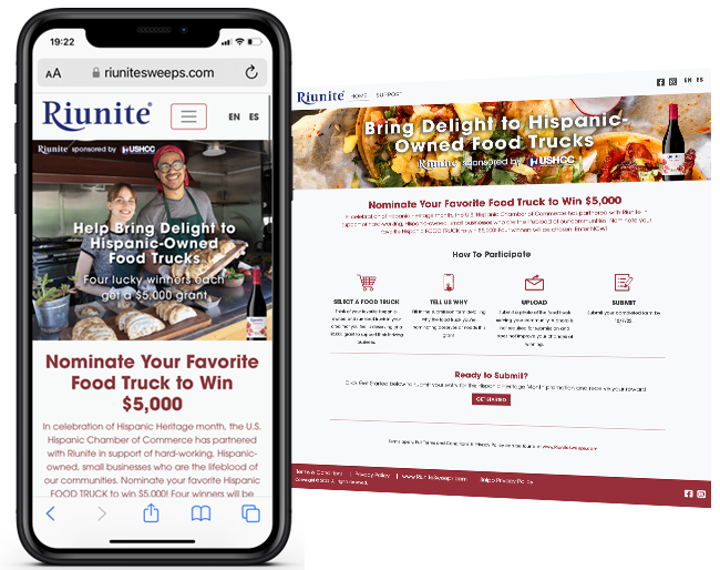 Snipp developed a register to enter sweepstakes where consumers can go to the contest page https://riunitesweeps.com/ and fill out the questionnaire to nominate their favorite Hispanic FOOD TRUCK and detailing why the food truck deserves / needs this grant to win one of (4) grants valued at $5,000