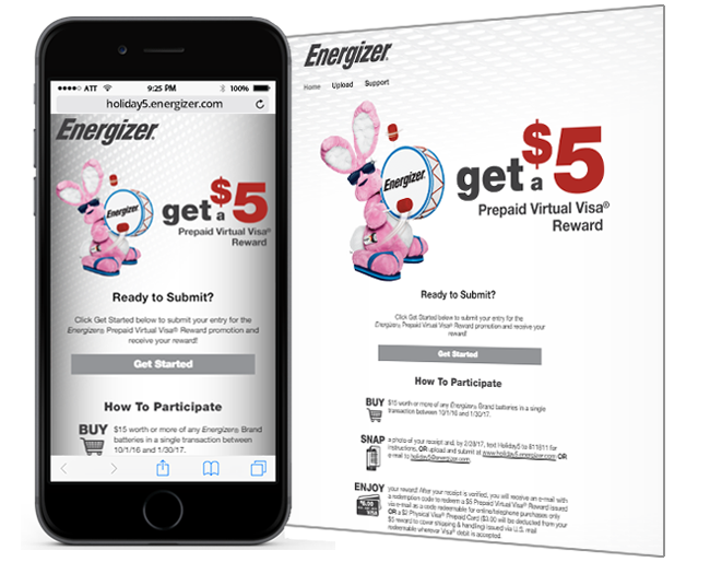 Snipp developed a national holiday program where consumers spend $15 in a single transaction to receive a $5 virtual Visa. Users also had the option to redeem for a physical virtual Visa, with the reward sent to them through mail. To participate, users simply texted HOLIDAYS to 811-811 to text in their receipt, or they could email it to holiday5@energizer.com, or upload it via web to www.holiday5.energizer.com.