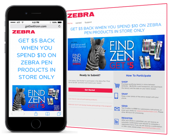 Consumers who purchased qualifying Zebra pen products in store can submit their purchase receipt by texting the keyword FINDZEN, by email to Redeem@Get5withZen.com or via web upload to receive a $5 rebate by check.