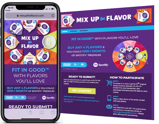 Snipp developed a sweepstakes program where consumers who purchase participating products could upload a photo of their receipt via text by messaging MIXITUP to 811811 or email to redeem@mixuptheflavor.com or web upload to earn a sweepstakes entry to win a $10 Spotify Gift Code.