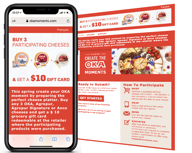 Snipp develops a solution where consumers who purchase qualifying OKA cheese products in a single transaction get a retailer gift card based on where they made the purchase. Consumers could submit their receipt online. Participating retailers include: Metro, Sobeys, Loblaws, Longos and Federated Co-op.