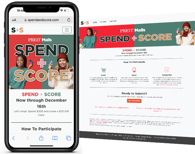 Snipp built a punchcard rewards program where consumers needed to spend $200 across multiple transactions at participating retail stores within PREIT Malls and upload their receipts on the promotion landing page https://www.spendandscore.com. Once they hit the $200 purchase threshold, they receive a $25 credit to a PREIT-branded redemption page.