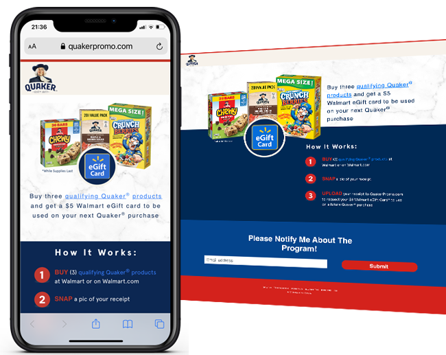 Propac Marketing partnered with Snipp to integrate the SnippWidget into their promotion site. Consumers purchase of any three QUAKER® products at Walmart, upload their receipt online to receive a $5 Walmart e-gift cardreward.