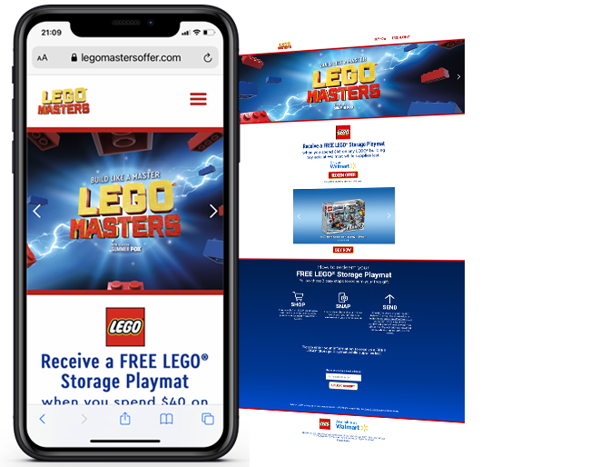 LEGO wanted to drive sales and basket spend at Walmart, and reward consumers with LEGO related merchandise. They needed a solution that could allow consumers to purchase both in-store and online at walmart.com.