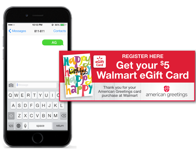 Snipp delivered a solution that ties exclusive Walmart content as a reward to a regional promotion, ticking off all the boxes that American Greetings looked to fulfill. Consumers who purchase American Greetings Products at select Walmart stores earn a $5 Walmart eGift card. To redeem the gift card, consumers can submit their receipt by texting it to 811-811 using the keyword AG, or by emailing it directly to redeem@AMGreetingsRewards.com By registering with their email, consumers help American Greetings grow their database for future marketing.