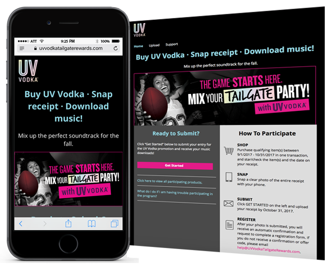 Snipp created a music rewards promotion with a theme of football and music to ignite passion among millennials. Consumers could purchase a bottle of any eligible UV product, and submit their receipt to receive a music download from a custom branded music store; consumers can choose from a catalog of millions of songs. Receipt submission was made easy through text or web upload technologies; consumers texted the keyword UV to 811-811, or website to upload their receipt and redeem their reward.