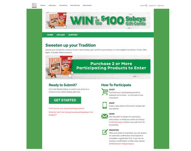 Snipp developed a purchase based sweepstakes where consumers who purchased any (2) qualifying products were entered for a chance to win one of (100) $100 Sobeys Gift Cards! Receipt submissions could be done by texting the keyword HOLIDAY to 811811, via email to Holiday-Contest@snipp.us or online at https://www.madewithnestle.ca/Sobeys-Contest