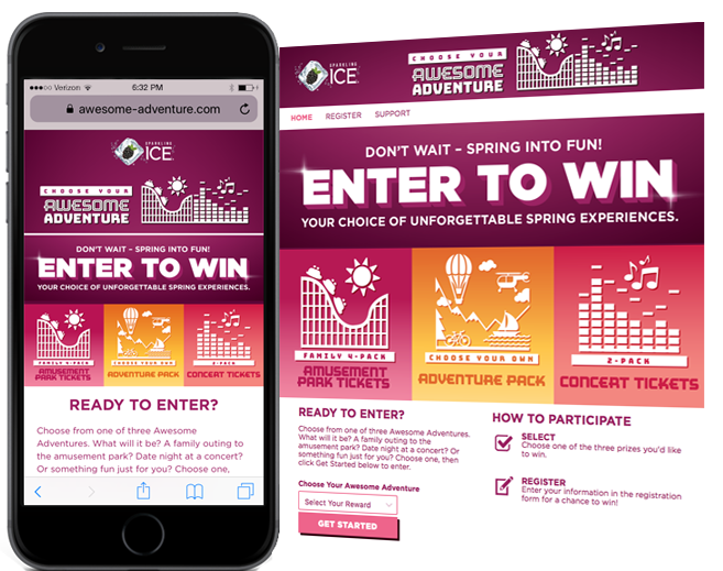 Sparkling Ice wanted to create excitement over their new Mystery Flavor product, and ultimately grow sales. Snipp created an experience driven sweepstakes, where consumers can visit a branded microsite to win experience-based prizes. Consumers select their desired adventure package once on the microsite, and register for a chance to win prizes such as amusement park tickets, concert tickets, and adventures.