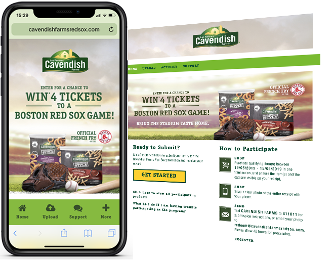 Leveraging Snippcheck, Snipp created an exciting sweepstakes program, where consumers who purchase any participating Cavendish Farms product at Market Basket locations could submit their receipt t by texting in the keyword CAVENDISH FARMS to 811 811, via email to redeem@cavendishfarmsredsox.com or web upload to receive a Cavendish Farms coupon AND earn a chance to win a Red Sox VIP experience.