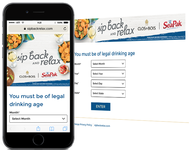 Clos du Bois needed a way to drive sales. Snipp created a co-branded partnership rewards promotion between Clos du Bois and SeaPak. Consumers can purchase a bottle of Clos du Bois in addition to a qualifying SeaPak frozen meal and submit their receipt to register and earn gift card rewards. In some qualifying states, participants are only required to purchase 2 SeaPak products. The program is age and state gated. Receipts can be submitted on a branded microsite at https://www.sipbackrelax.com, and consumers can text EASY to 811-811 for microsite access.