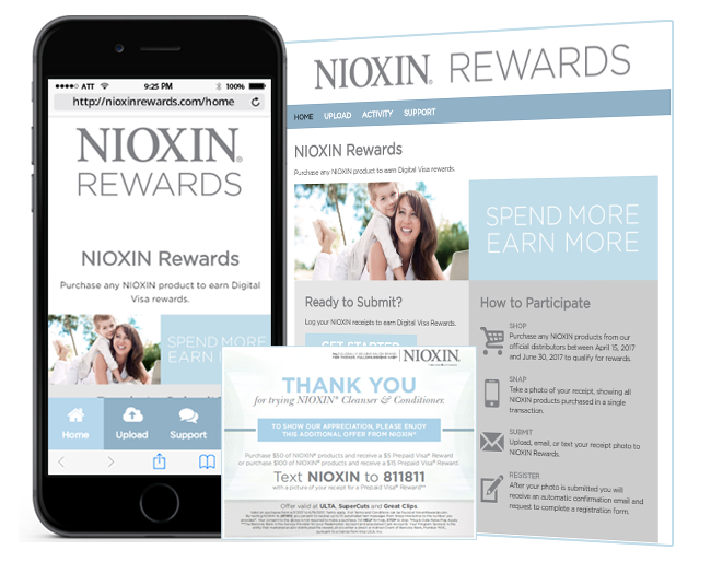 Snipp set up a program on the SnippCheck platform where consumers who make qualifying purchases at participating retailers can submit their receipt by texting in the keyword NIOXIN to 811811, via email to submit@nioxinrewards.com or web upload at http://NioxinRewards.com.