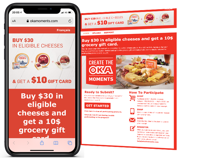 Snipp developed a digital gift-card promotion on our receipt processing platform where consumers who purchase qualifying OKA cheese products in a single transaction could upload their receipt and get a retailer gift card depending where they purchased. Participating retailers include: Metro, Sobeys, Loblaws, Longos and Federated Co-op.