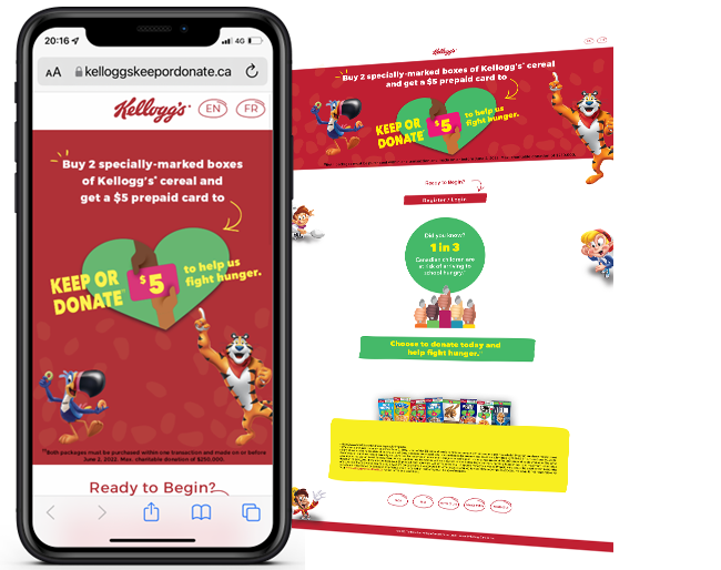 Kellogg's was looking to create an exciting national promotion to drive sales of select products and also tie the program into a good cause. They needed a partner who could integrate into their current front end solution as well as help develop the creative for the experience.
