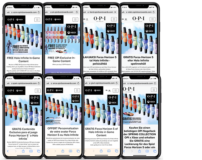 Xbox is partnering with OPI on a global, exclusive line of nail polish and was looking to reward consumers with exclusive in-game content for Forza and Halo. Xbox & OPI needed a partner who could help them execute 15 programs across 12 countries and provide various levels of support in each country.