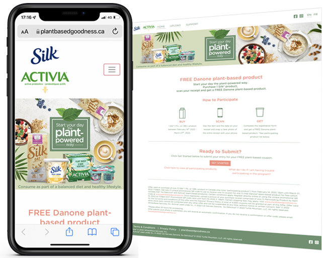 Danone was looking to drive sales and trial of their plant-based portfolio of products and drive awareness of the many products within their portfolio. In addition, Danone wanted to reward shoppers and incentivize repeat shopping trips.