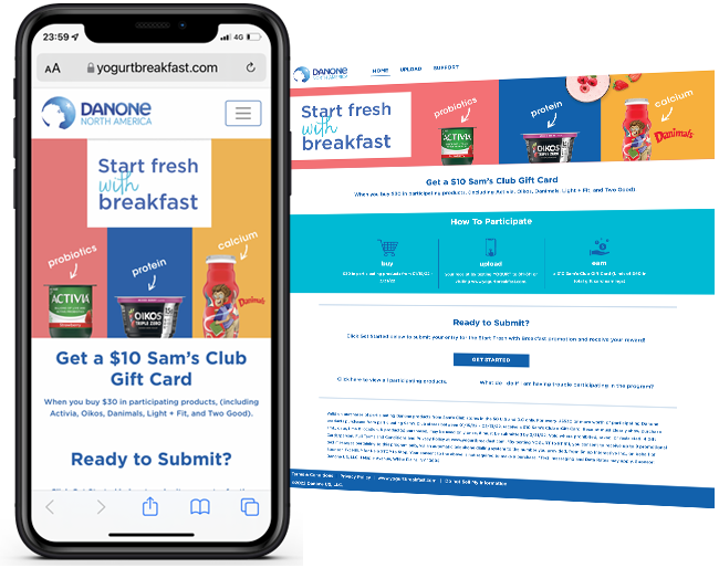 Snipp developed a purchase based promotion where consumers who purchase $30 worth of Danone products at Sam's Club over multiple transactions can upload their receipt y texting in the keyword YOGURT, email to redeem@yogurtbreakfast.com or direct upload to get a $10 Sam's Club e-Gift Card. Danone also took advantage of Snipp's full basket analysis data to get deep insights into consumers entire basket, category makeup, and competitor products.